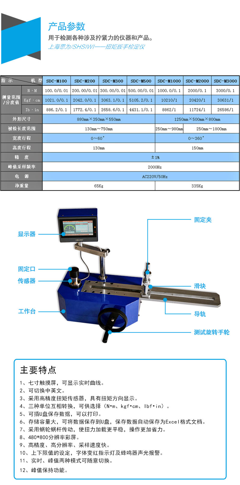 SDC—M扭矩扳手檢定儀是檢定扭矩扳子、據矩起子的專用設備,主要用于檢測各種定力式扭力扳手,數顯式扭力扳手、預置式扭力扳手。廣泛應用于電氣制造、機械制造、汽車輕工和專業科研和檢測行業。扭矩力值數字式及儀表式顯示,準確直觀,各種榫眼配制簡單,便于裝夾。